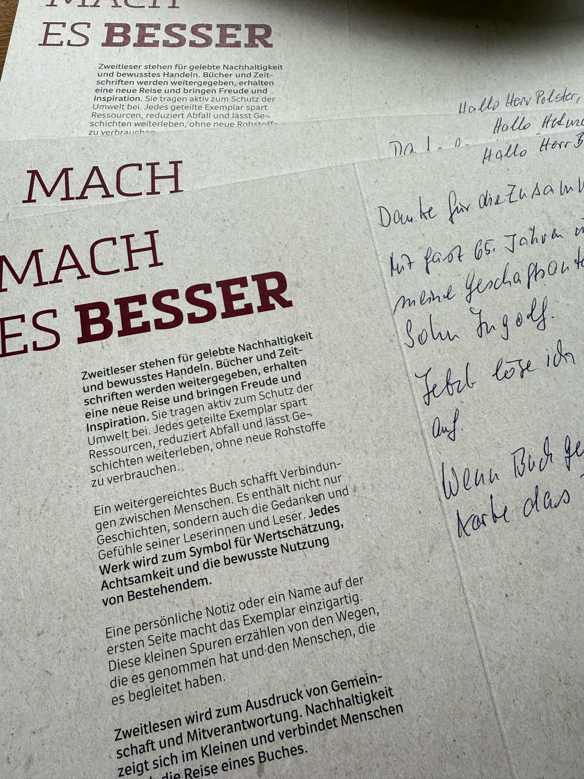 Jede trägt die Überschrift „Mache es besser“. Dahinter steckt mehr als nur eine Geste: Es geht mir um gelebte Nachhaltigkeit, um bewusstes Handeln und um die Freude am Teilen. Bücher und Zeitschriften müssen nicht in Regalen verstauben – sie dürfen weitergegeben werden, erhalten eine neue Reise und bringen so Freude, Wissen und Inspiration zu neuen Lesern.